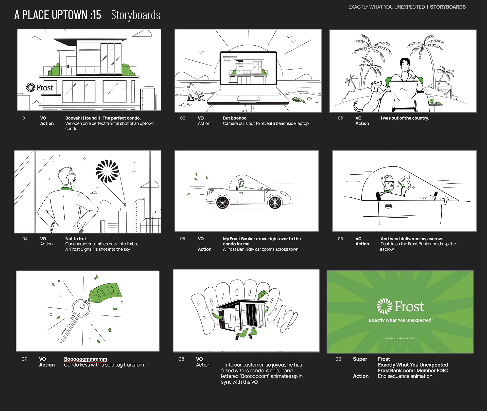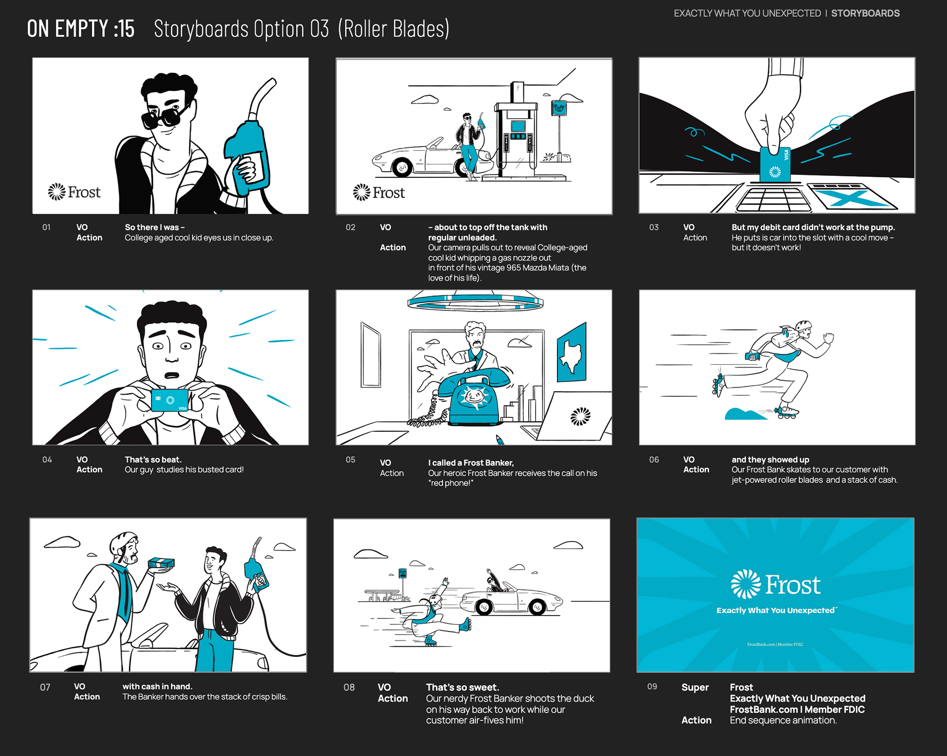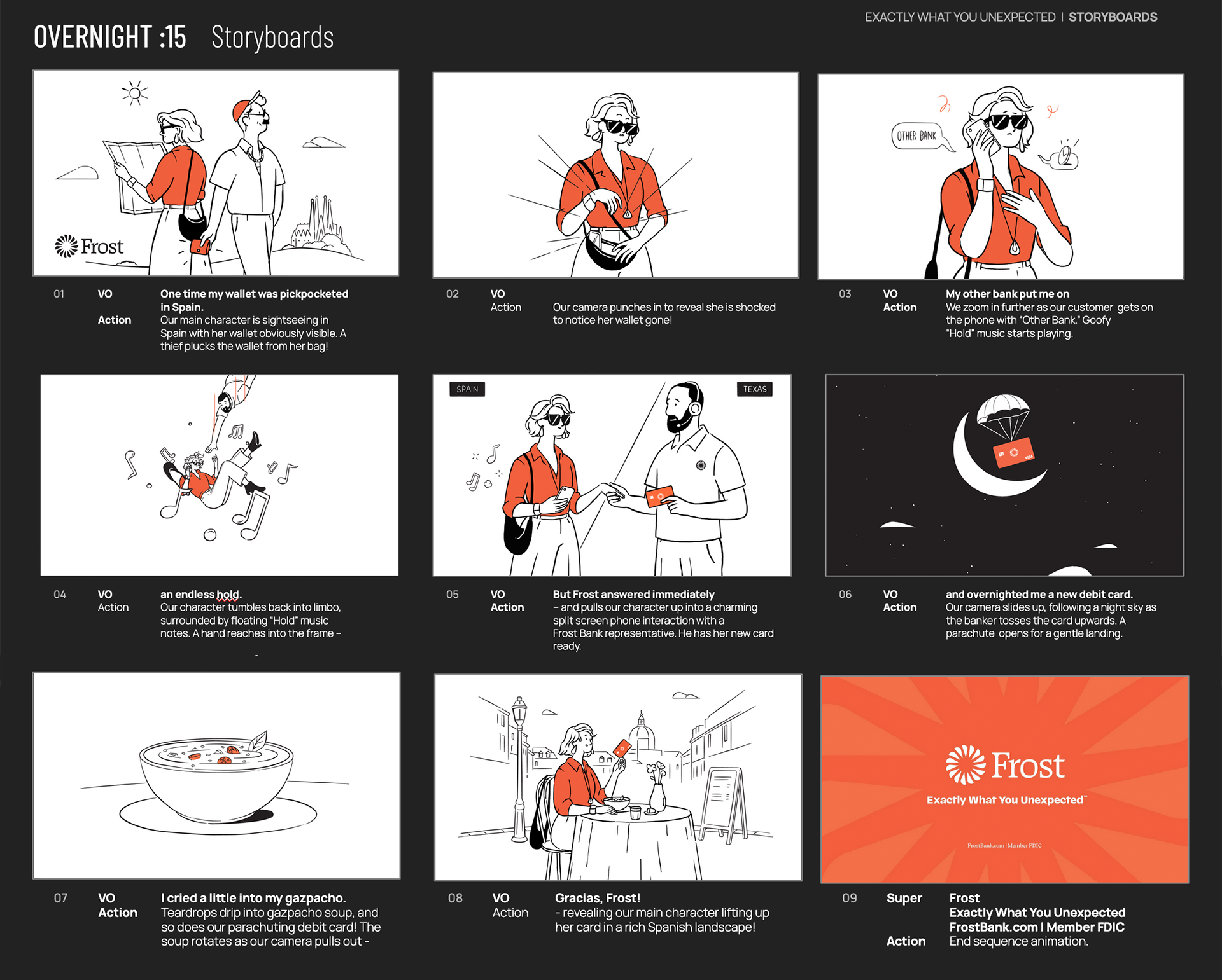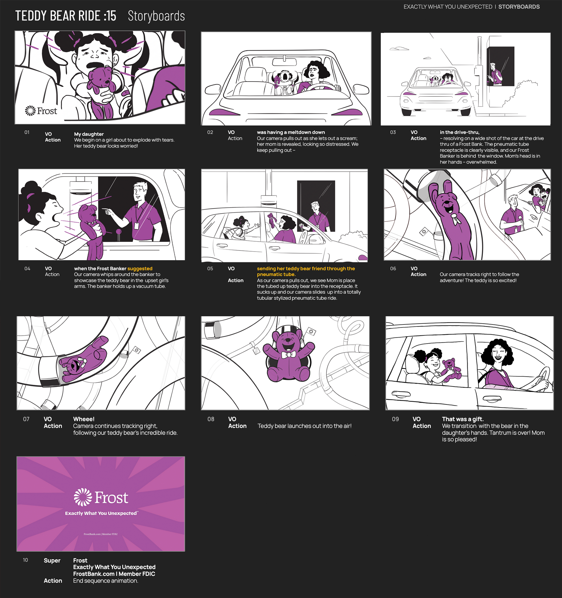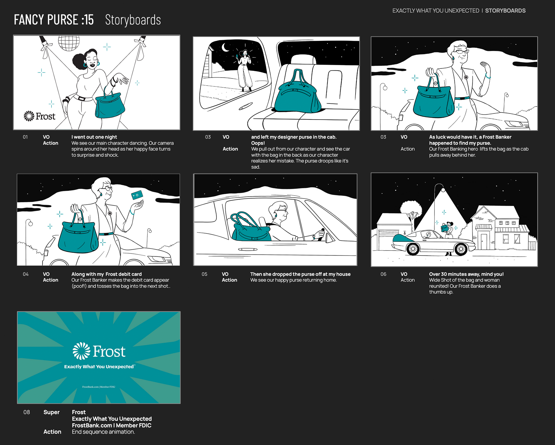 Paired up with Dress Code to design and animate the illustrated aspect of the Frost Bank Expect the Unexpected Awareness campaign. We brought to life the remarkable true stories of Frost Bank employees going above and beyond the call of duty to help customers. Through playful fluid camera moves and solid design, we were able to pack a lot of story into 5 15 second spots and 5 06s.